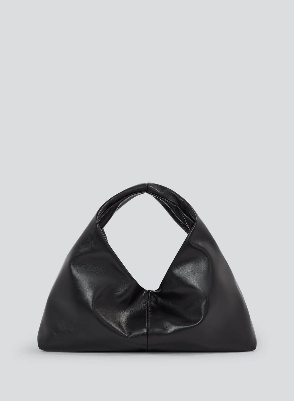 The Anchor Small Leather in black. Crafted from lamb leather, soft, smooth, and naturally durable. This handbag features an inner drawstring bag with a gun metal cord stopper to keep belongings secure from day to night. The small version can be worn comfortably in your hand or over your shoulder.