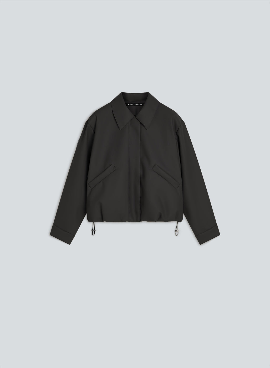 The Bomber short coat made of the signature rubber, in the color black. With its relaxed and boxy shape, adjustable waist and welt pockets, the Bomber is the perfect companion for outdoor exploration.